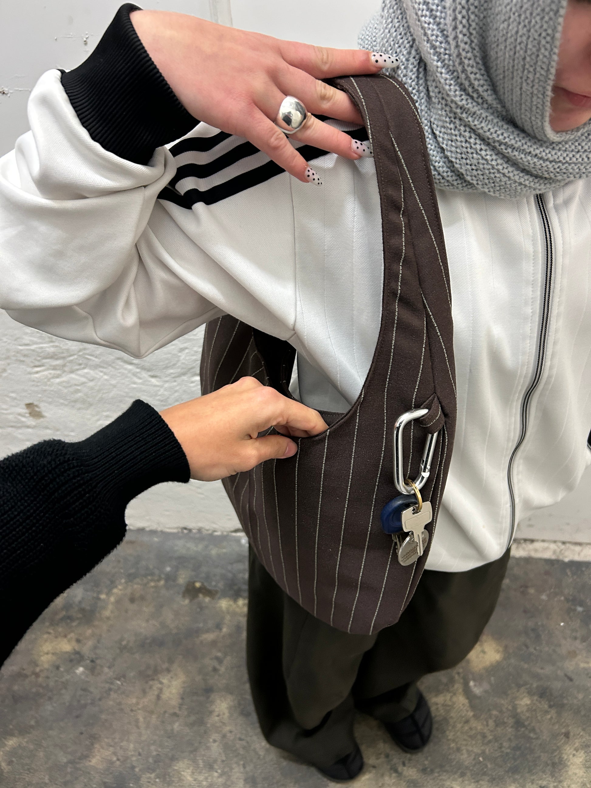 Our dark brown striped medium EGG is the perfect shoulder bag for your on-the-go lifestyle. With enough space to carry your personal belongings like your sweater, camera, bottle and more, it’s ideal for your daily adventures.