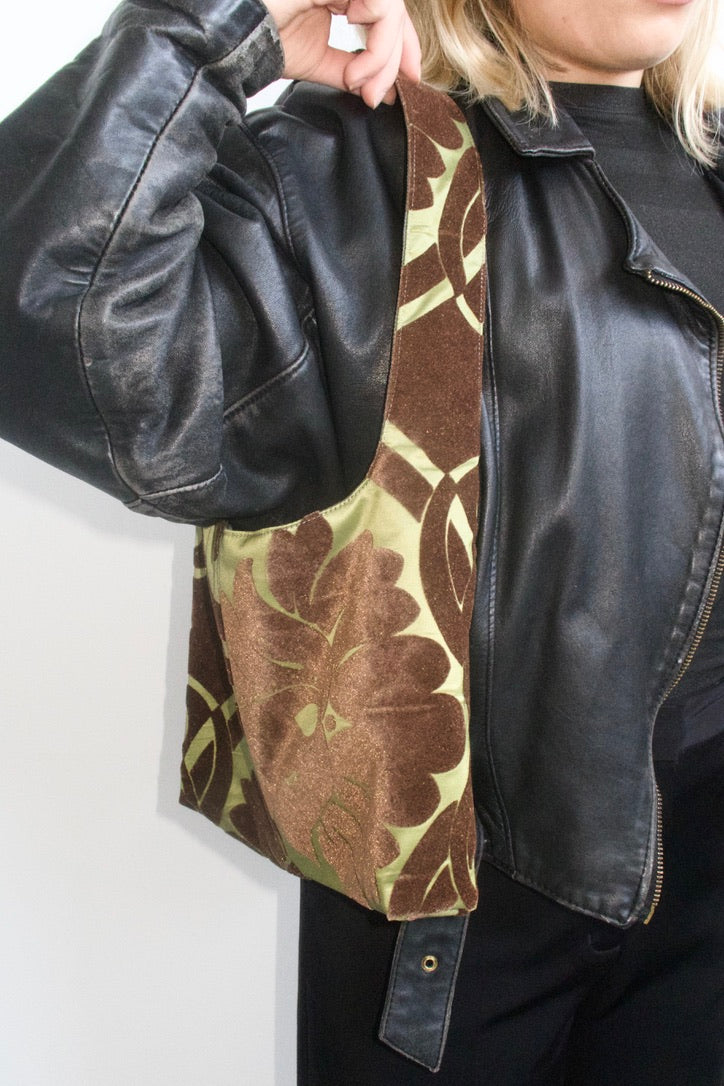 The green floral mini shoulder bag is made from upcycled leftover materials and has little shiny details. With its compact size, it is the perfect accessory for on-the-go. It features a magnetic closure as well as an inside pocket.