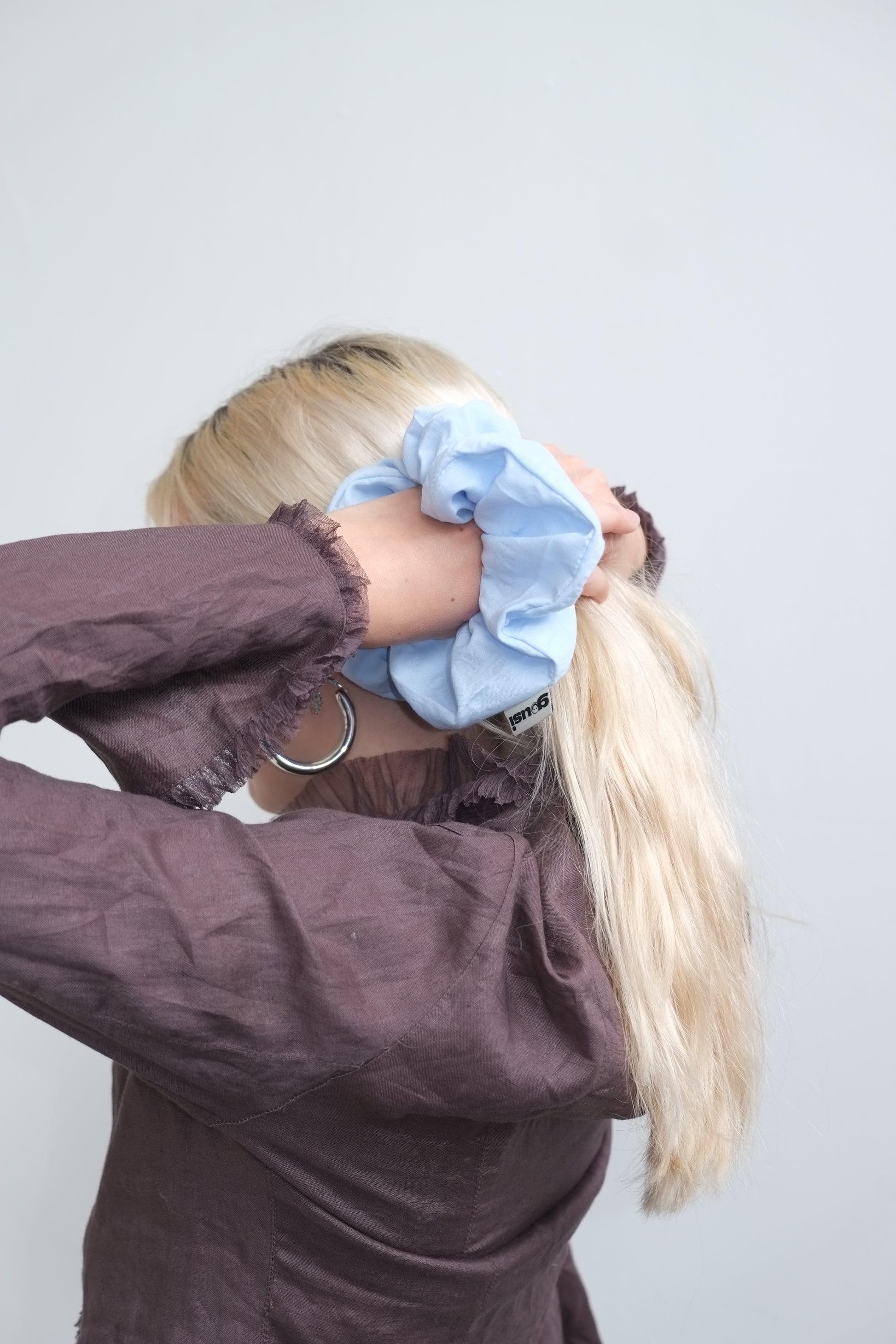 The light blue oversized scrunchie is made from soft upcycled fabric and has little shiny dots. This little accessory is a big eye-catcher that adds a unique touch to your look. It's super comfortable to wear and perfect for adding some playful flair to any outfit.