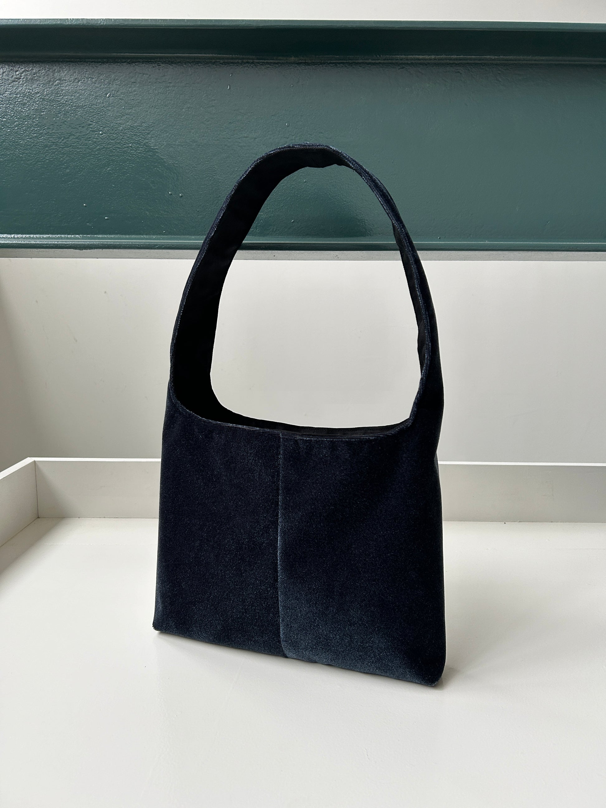 The midnight blue mini shoulder bag is made from soft upcycled leftover materials. With its compact size, it is the perfect accessory for on-the-go. It features a magnetic closure as well as an inside pocket.