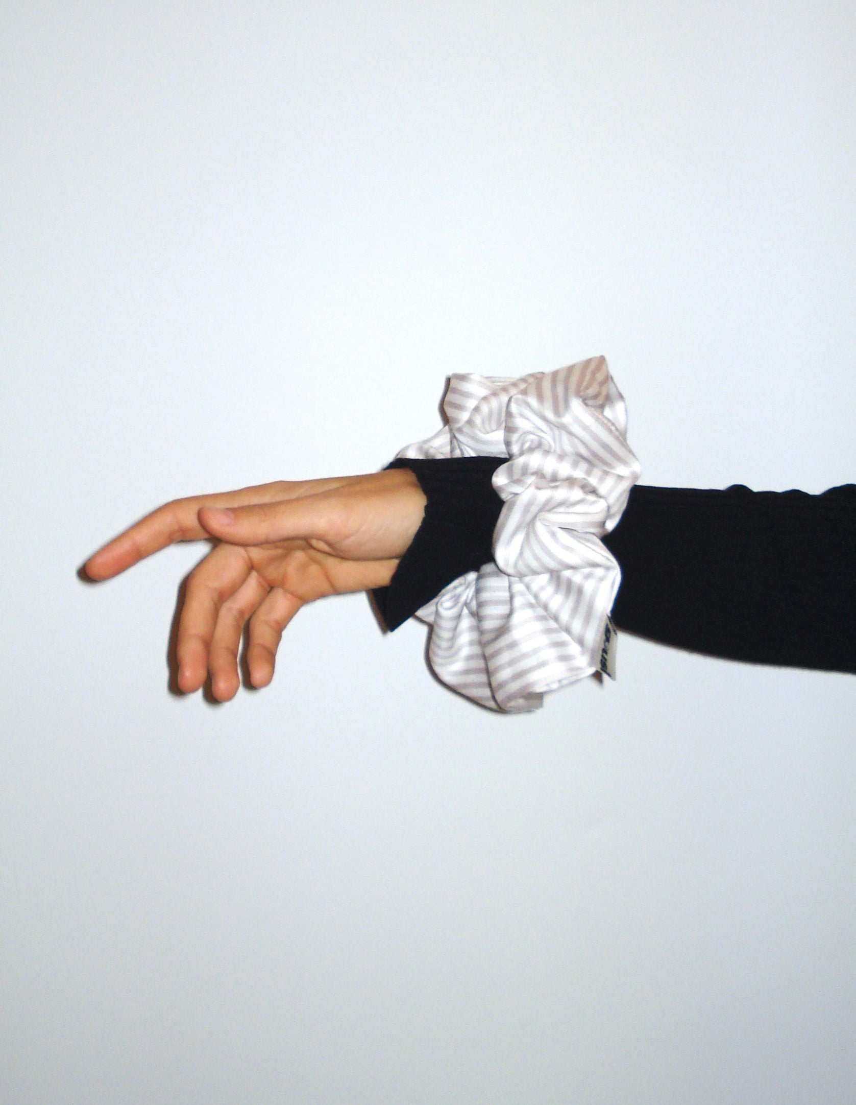 The white striped oversized scrunchie is made from soft upcycled fabric. This little accessory is a big eye-catcher that adds a unique touch to your look. It's super comfortable to wear and perfect for adding some playful flair to any outfit.